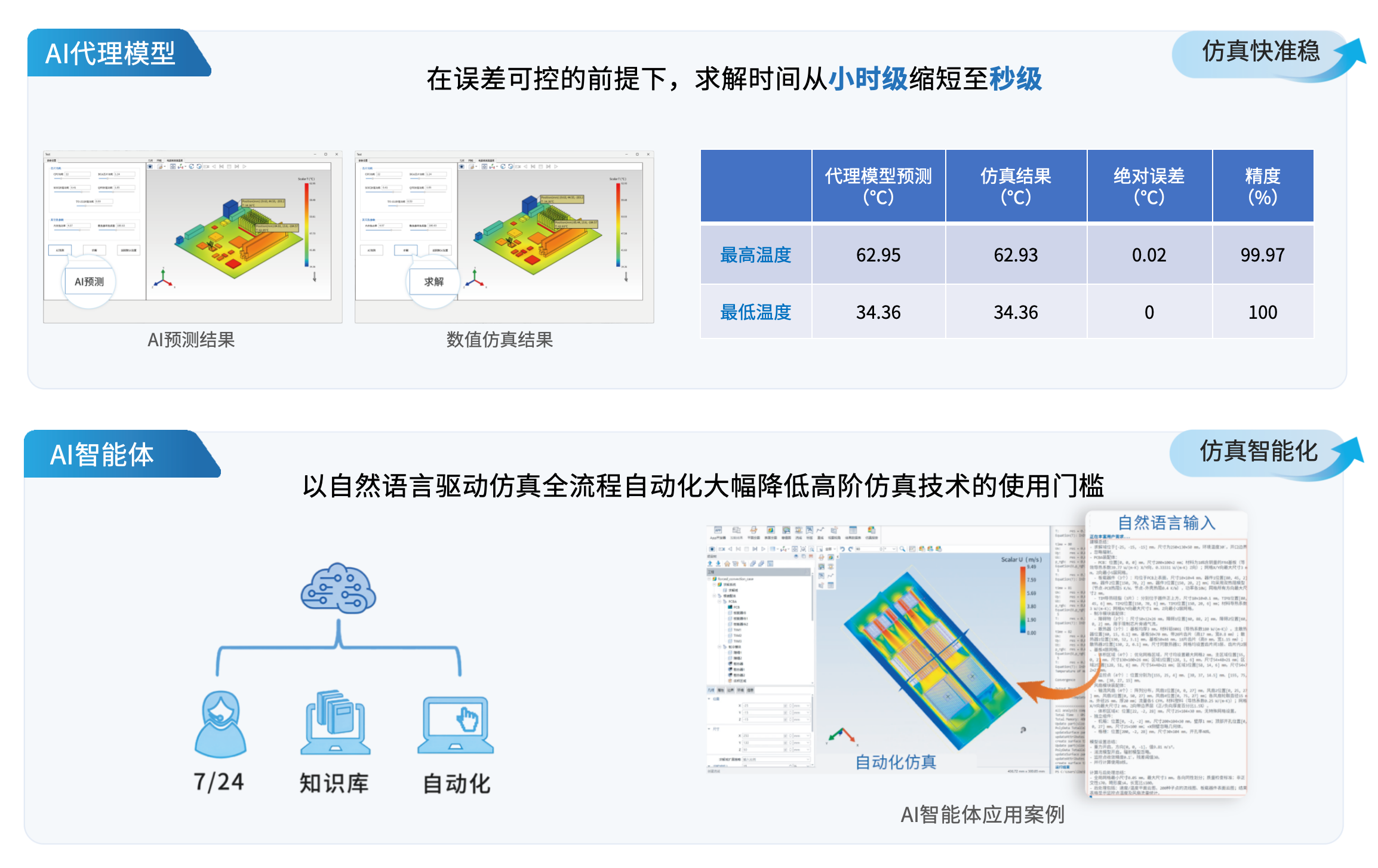 针对仿真耗时长、迭代速度慢、智能化不足的痛点,1488.威尼斯电子游戏深度融合AI技术,助力“仿真效率革命”。产品内置的AI代理模型可根据仿真生成的数据对电子元器件及设备的散热状况进行高精度预测,大幅提升仿真速度。同时,AI智能体支持用户以自然语言驱动自动化仿真全流程,大幅降低高阶仿真技术的使用门槛。
