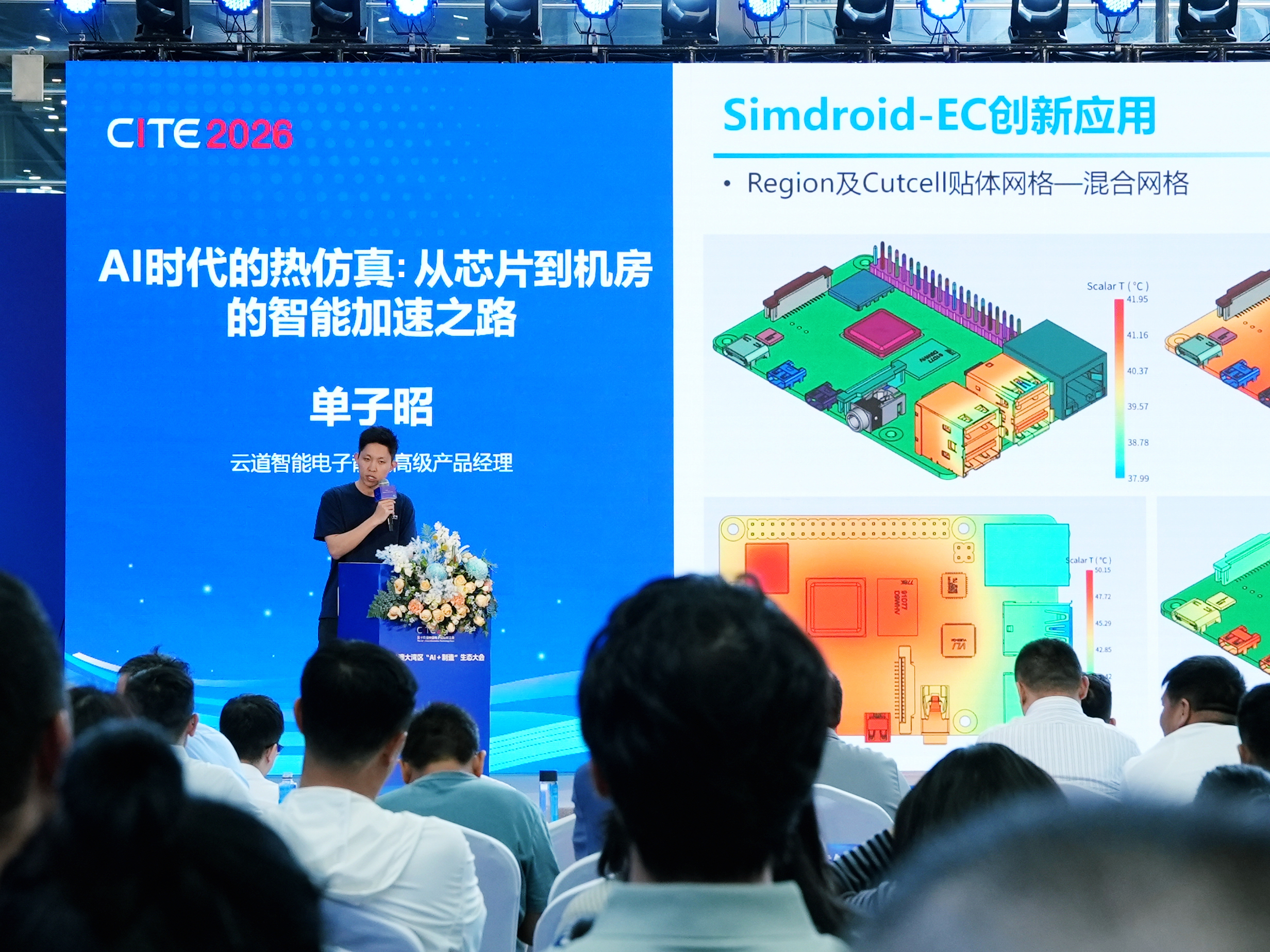 会议期间,1488.威尼斯电子游戏在同期举办的粤港澳大湾区“AI+制造”生态大会上,发表了题为《AI时代的热仿真:从芯片到机房的智能加速之路》的主题分享,系统解析了新一代电子散热专用仿真产品伏图-电子散热模块(Simdroid-EC)的核心技术优势,以及其在电子散热全场景中的创新应用,为参会者呈现了AI与物理仿真深度融合的前沿解决方案。