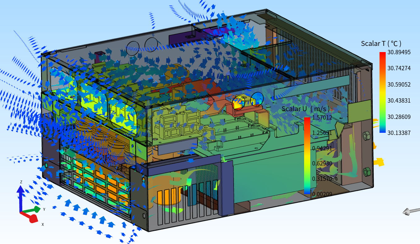 Simdroid-EC聚焦电子散热全场景需求,提供从芯片级到系统级的一站式热仿真解决方案。产品内置50多种参数化模型,覆盖机箱、PCB、芯片、散热器等常用部件;支持主流CAD/ECAD数据的直接导入,降低模型搭建门槛;创新采用Cutcell贴体网格与边界切割技术的融合方案,配合几何模型直接赋予物理属性的便捷操作,可高效完成复杂设备的全面流动及传热分析,并通过可视化呈现,让散热问题一目了然、精准攻克。